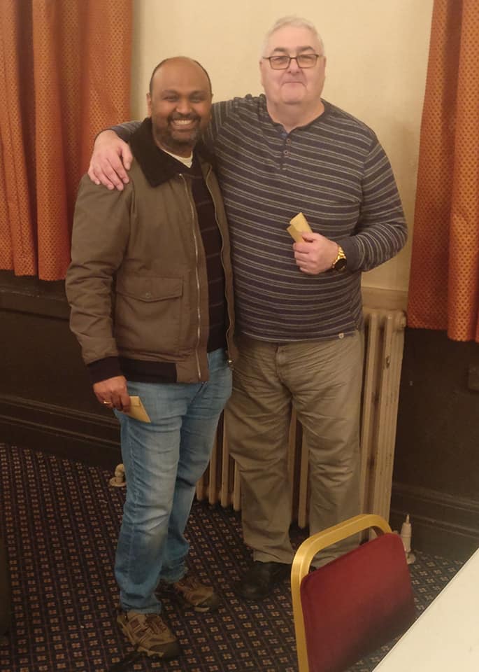 Vijay Kakarparthi and Jeff Foy finished joint second in the Minor with 5 out of 6. There was also a good performance by Mark Hann in the Open, finishing joint 5th with 3½, including draws against the eventual winner IM Joseph McPhillips, and FM Paul Macklin. Below are Jeff & Vijay at the prizegiving.